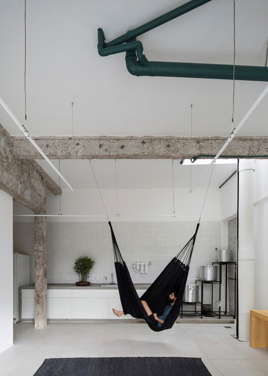 A Garagem Itamonte, por Zebulun Arquitetura aproveita do espaço para atender uma produção de cervejas artesanais, introduzindo uma grande sala com cozinha aberta, uma suíte, um banheiro e áreas de manutenção.