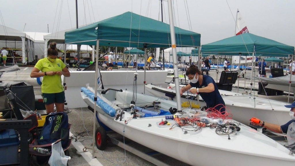 ”Foram dias intensos até aqui. Hoje conseguimos colocar o mastro pra cima e pra gente, ir pra água, será um alívio”, disse Martine Grael, ouro na Rio 2016 ao lado de Kahena Kunze.
