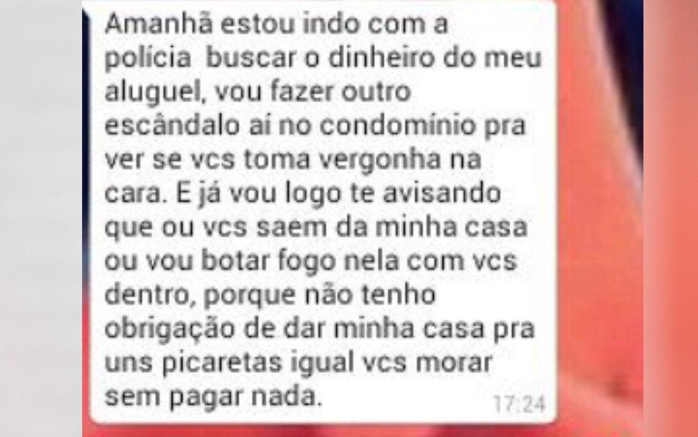 “Ou vocês saem da minha casa ou vou botar fogo nela com vocês dentro, porque não tenho obrigação de dar minha casa para uns picaretas igual vocês morar (sic) sem pagar nada”, diz a mensagem.