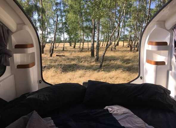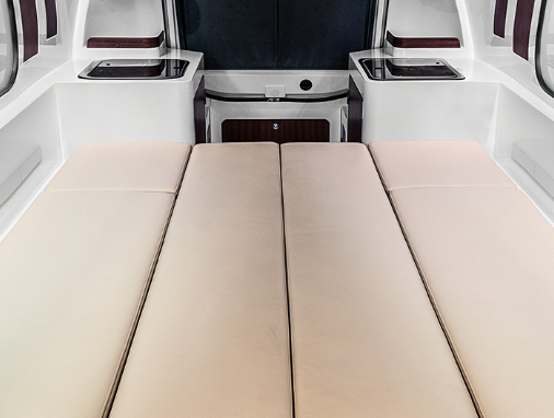 O trailer acomoda até seis pessoas em sofás (mas para dormir de fato, flutuando, não comporta tudo isso) que, quando unidos, transformam-se numa cama.