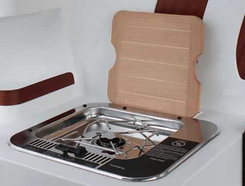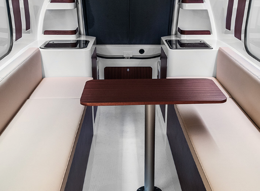 Na cabine, uma mesa removível para refeições e teto solar, mini-cozinha e banheiro.