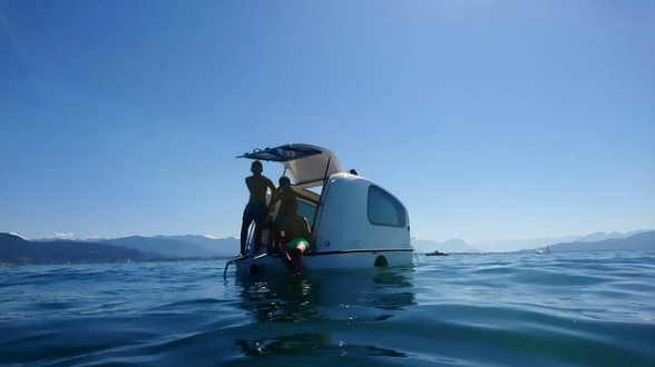 O veículo anfíbio é um trailer, uma caravana e um iate em um só lugar.