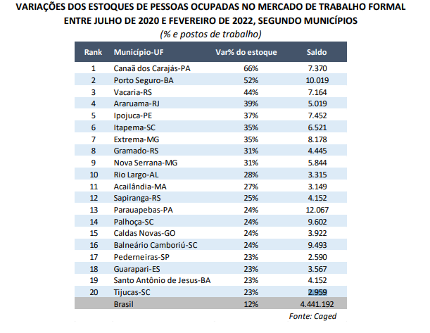 A Confederação Nacional do Comércio de Bens, Serviços e Turismo (CNC) fez um levantamento das 20 cidades do Brasil que mais empregaram nos últimos 20 meses – entre julho de 2020 e fevereiro de 2022.