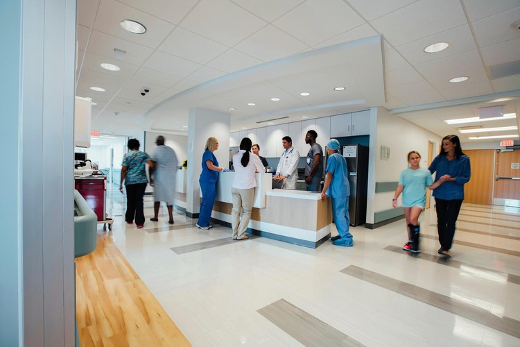 Os arquitetos podem projetar instalações hospitalares com caminhos mais intuitivos por meio do planejamento geral e sistemas de sinalização.
