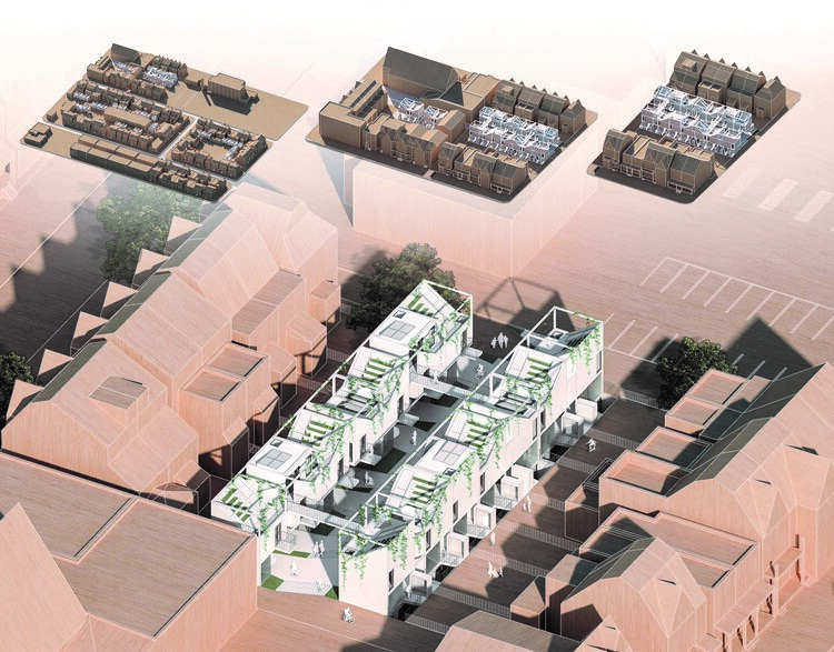 A rede de hortas nas cobertas gera uma pequena fazenda urbana, compartilhada e acessível por aberturas laterais intralotes ou passarelas suspensas, que atravessam a laneway e conectam as unidades habitacionais.