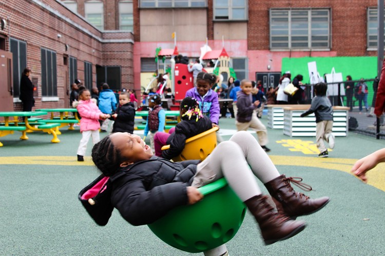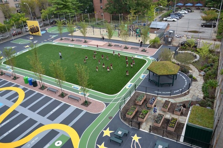 Estima-se que os pátios escolares comunitários somente na cidade de Nova Iorque capturem mais de 85 milhões de litros de água da chuva anualmente.