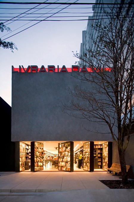O arquiteto paulistano Isay Weinfeld, no projeto para a Livraria da Vila, projeta um volume monolítico que parece apoiar-se sobre delgadas estantes de livros.