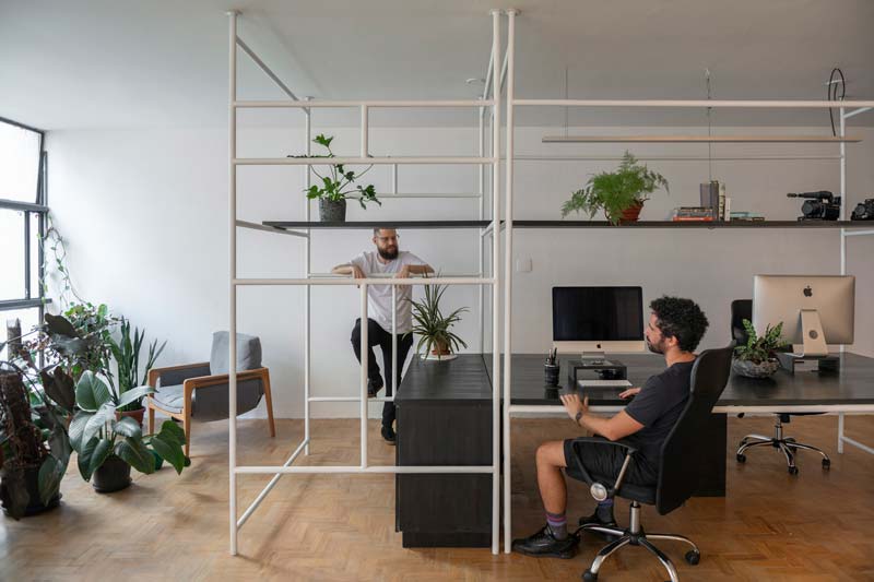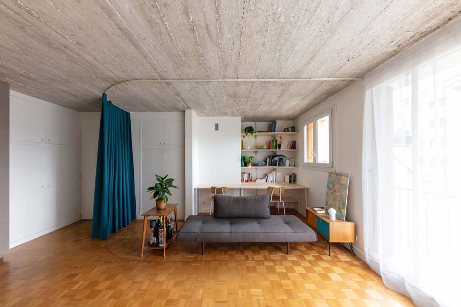 Divisórias móveis e leves, sejam cortinas, painéis ou outras possibilidades de separação de ambientes de forma flexível, têm uma grande vantagem em espaços com dimensões reduzidas. Quando totalmente abertos, esses elementos promovem uma maior integração entre os espaços, enquanto que, ao serem mantidos fechados, ocupam menos espaço frente às alternativas tradicionais de divisão de ambientes, como as paredes de alvenaria ou drywall.