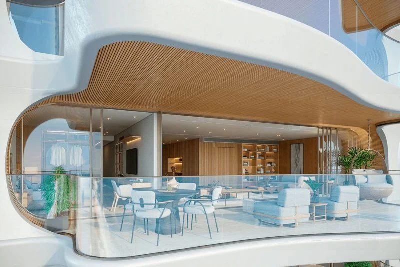 Já na parte interna, são três tamanhos de apartamentos: o primeiro andar tem 315 m², enquanto os outros quatro são de 284 m²; a cobertura duplex, no sexto andar, possui 501 m². A planta original de todas as unidades prevê quatro suítes e vista para a praia.