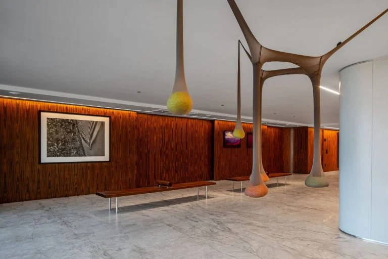 Com todos os apartamentos vendidos desde antes das obras terminarem, um dos maiores diferenciais do prédio é sua galeria de arte. Espalhadas pelo lobby, estão 14 obras de renomados artistas nacionais, como Vik Muniz, Sebastião Salgado, Claudia Andujar e Ernesto Neto. A escultura ‘As Três Graças’, de Iole de Freitas, decora a frente do Tom.