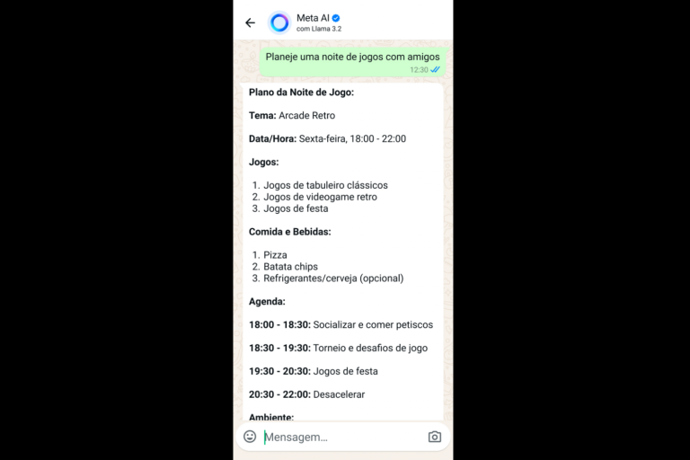 Para ativar o Meta AI em conversas, digite “@MetaAI”. No momento, não há uma opção para remover a ferramenta do aplicativo, mas a utilização é opcional.