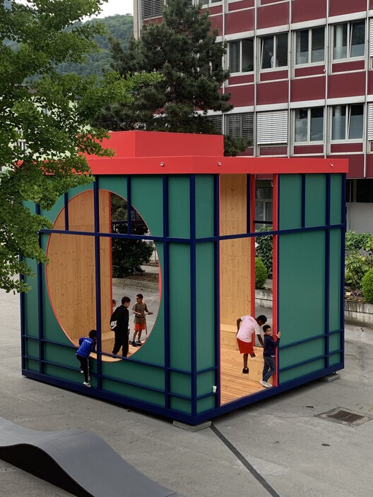 “Os pavilhões são um primeiro gesto para concretizar as ambições do município de realmente tornar esta praça em um lugar de encontro, um lugar para os moradores. Assim, propusemos mais de uma função para a instalação: uma biblioteca pública, um observatório, uma mesa coletiva com bancos e um pequeno teatro”.