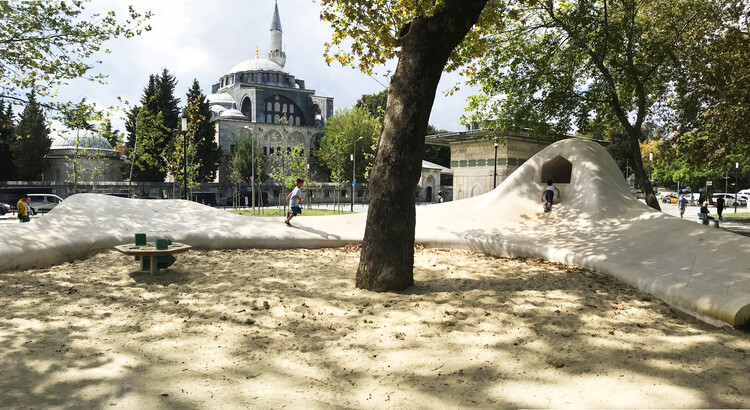 “Ao conceber este projeto, rompemos com o conceito de playground regular que se baeia em atividades diretivas e interações limitadas; em vez disso, criamos um elemento multifuncional que inspira a brincadeira. Nossa abordagem não convencional resultou em um objeto escultural suave, atraente e lúdico para todos – crianças e adultos. (…) O parque infantil não é um espaço vedado onde os pais observam à distância, é para todos, aberto a quem não tem medo de se envolver”.