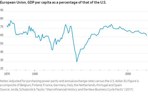 PIB per capta na União Europeia em relação ao PIB per capta dos Estados Unidos