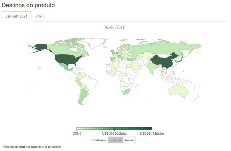 No primeiro semestre de 2021 ele foi responsável por 1,64% do total de exportações do Brasil, o que equivale a 2.6 bilhões de dólares só de janeiro a julho de 2021, sendo o 13º produto no ranking de exportações totais do país.