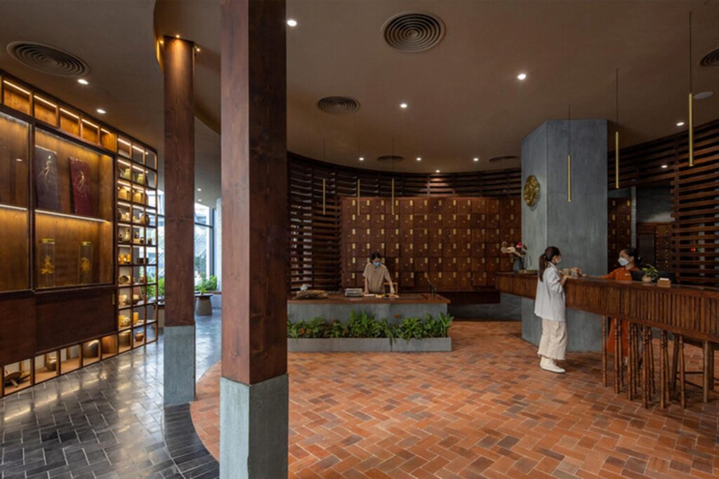 Usar esses dois materiais naturais contrastantes no chão permite que a clínica crie uma curva elegante que “não apenas decide cada função, mas também destaca a imagem do farmacêutico tradicional, preparando cada dose com cuidado e precisão”, como descrevem os arquitetos, “ajudando os pacientes a entenderem melhor e confiar nos métodos da medicina tradicional”..