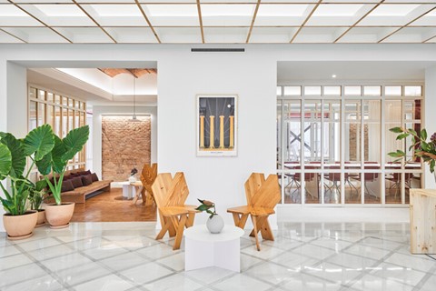 Essa estratégia é usada para redescobrir as estruturas e materiais originais através de “janelas internas”, como descreve Scob, enquadrando os pisos de madeira de tonalidade natural, paredes de tijolos e tetos abobadados catalães.