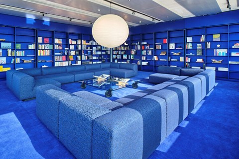 E entre as nuvens dos andares mais altos, que parecem tocar o céu, uma biblioteca azul abrangente é suavizada por um carpete azul grosso e profundo.