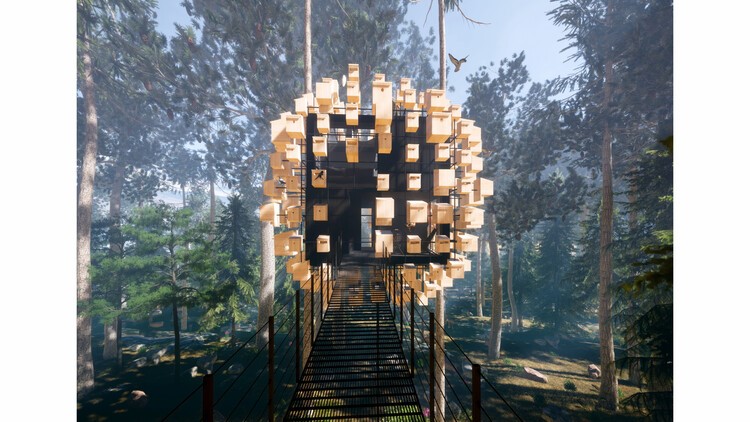Projeto de quarto de hotel nas copas das árvores envolto em ninhos de pássaros
