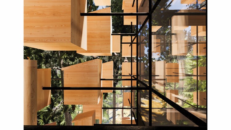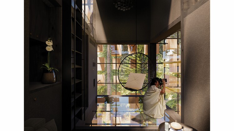 O interior escuro direciona a atenção dos hóspedes para fora, e um terraço na cobertura permite vistas panorâmicas da floresta.