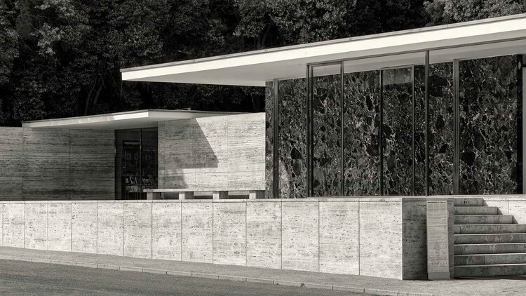 Construído em 1929 como parte da Exposição Internacional de Barcelona, o pavilhão pretendia representar a face da Alemanha após a Primeira Guerra Mundial como uma cultura progressista e moderna, mas ainda enraizada em sua história clássica.