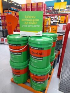 A Suvinil realiza treinamento com os vendedores das lojas, oferecendo material informativo para que possam abordar os clientes no momento da venda. Isso estimula o consumidor a lembrar-se de trazer as sobras dos produtos de volta para descarte apropriado.