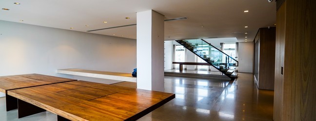 Lá, uma porta de correr de madeira se abre para revelar um apartamento triplex, com mais de 700m².